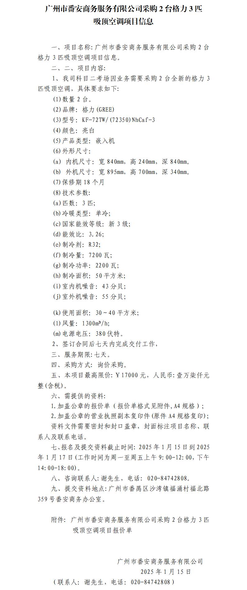 附件:廣州市番安商務服務有限公司采購2臺格力3匹吸頂空調項目項目報價單.xls