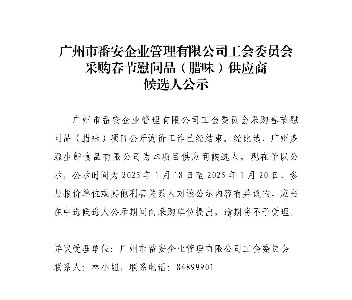 廣州市番安企業(yè)管理有限公司工會(huì)委員會(huì)采購(gòu)春節(jié)慰問(wèn)品(臘味)供應(yīng)商候選人公示