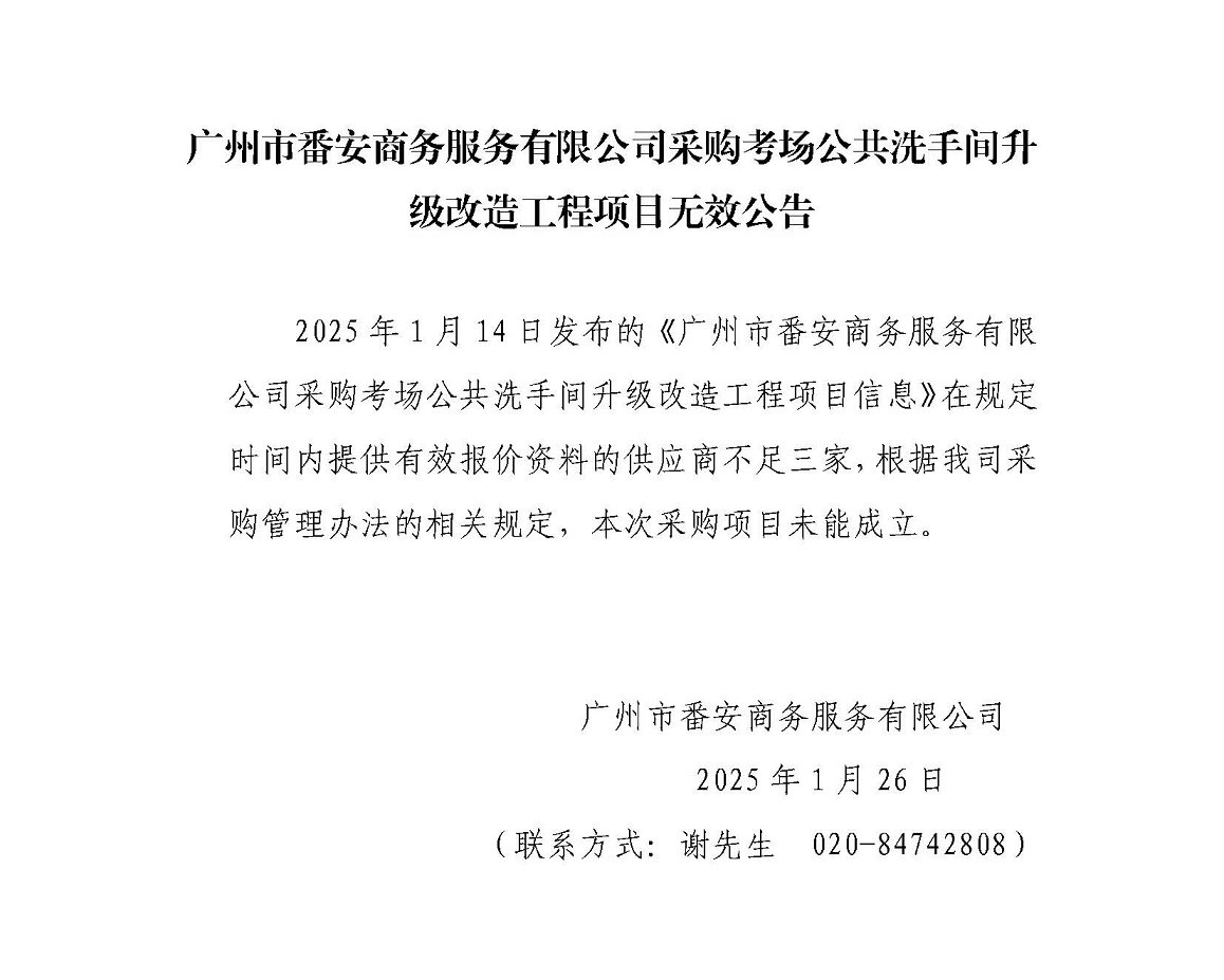 廣州市番安商務服務有限公司采購考場公共洗手間升級改造工程項目無效公告