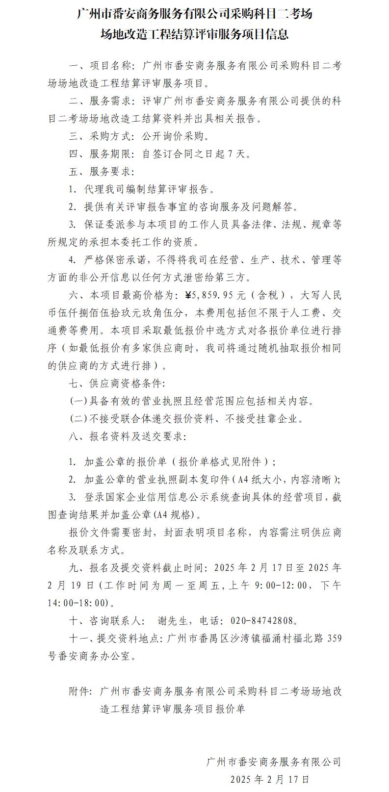 附件:廣州市番安商務(wù)服務(wù)有限公司采購科目二考場場地改造工程結(jié)算評審服務(wù)項目報價單.xls