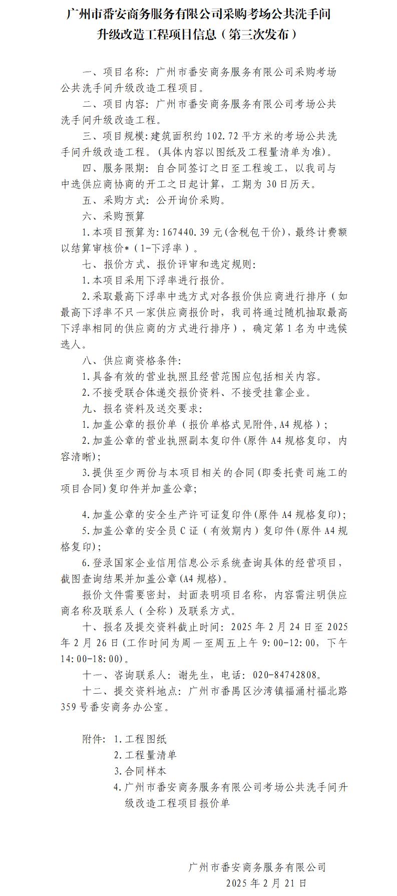 廣州市番安商務(wù)服務(wù)有限公司采購(gòu)考場(chǎng)公共洗手間升級(jí)改造工程項(xiàng)目信息(第三次發(fā)布)