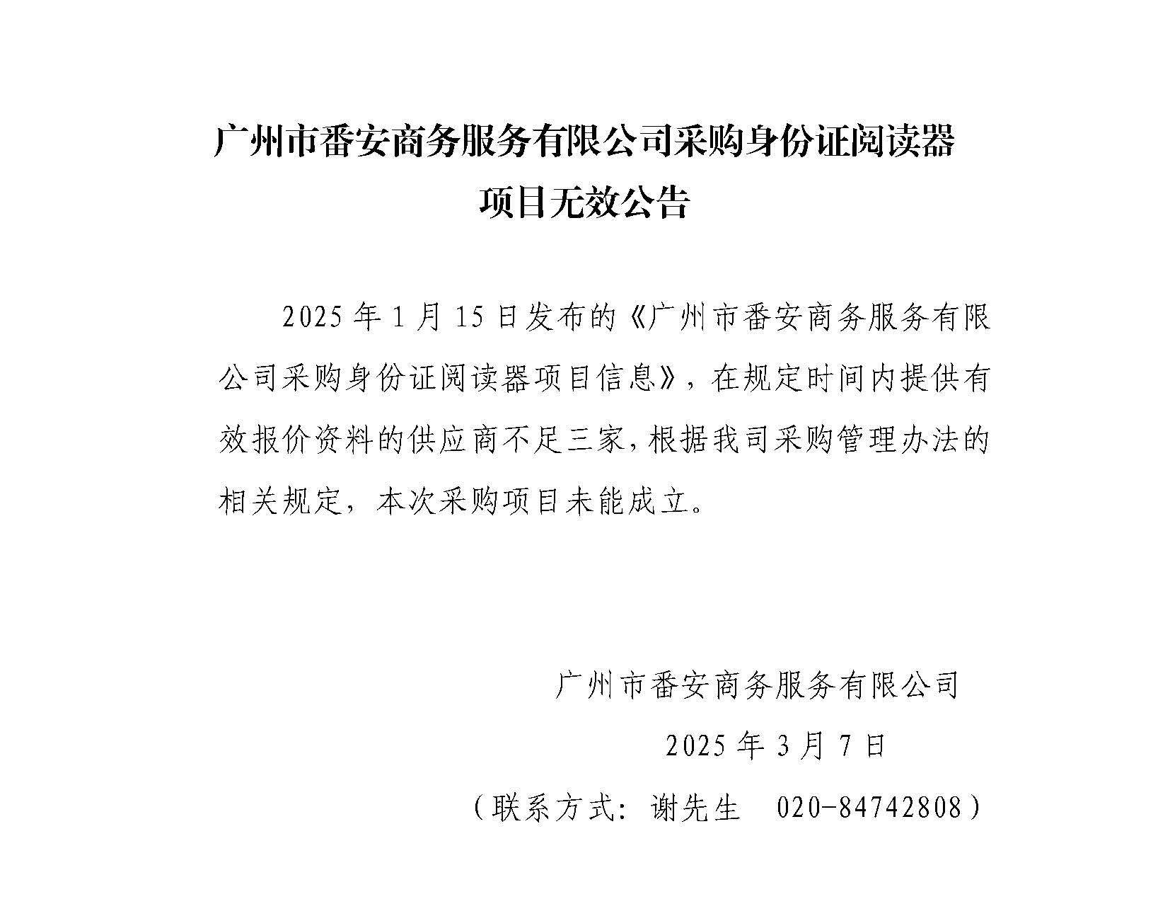 廣州市番安商務服務有限公司采購身份證閱讀器項目采購無效公告