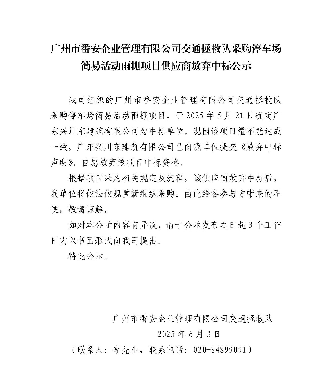 廣州市番安企業(yè)管理有限公司交通拯救隊(duì)采購(gòu)?fù)\噲?chǎng)簡(jiǎn)易活動(dòng)雨棚項(xiàng)目供應(yīng)商放棄中標(biāo)公示