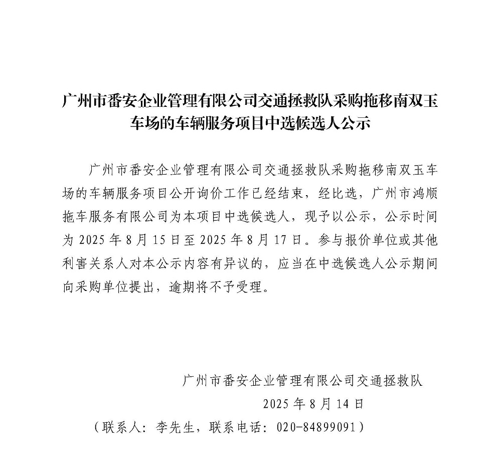 廣州市番安企業(yè)管理有限公司交通拯救隊(duì)采購(gòu)?fù)弦颇想p玉車(chē)場(chǎng)的車(chē)輛服務(wù)項(xiàng)目中選候選人公示